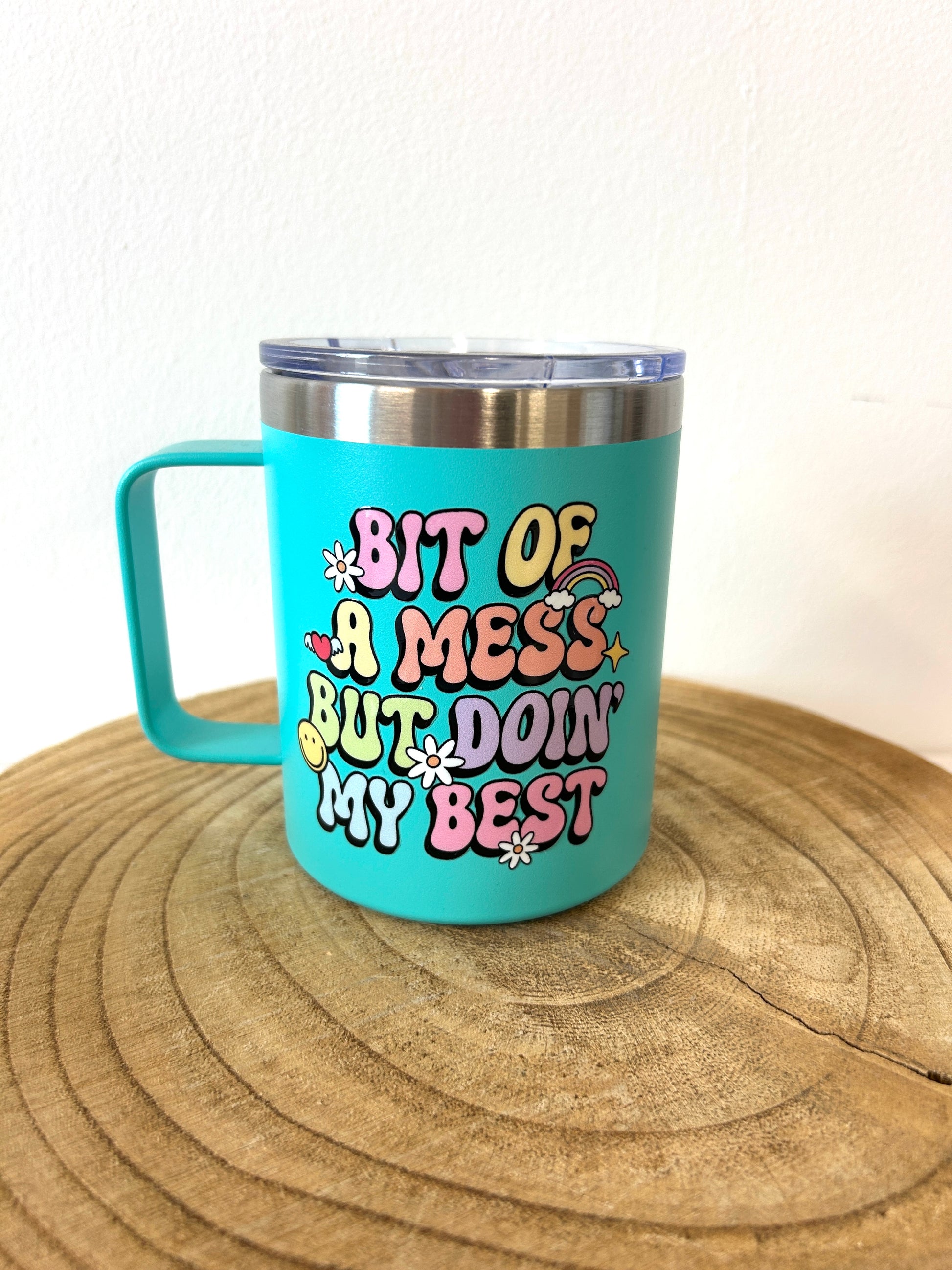 Stainless steel travel cup printed with 'Bit of a mess but doin my best'