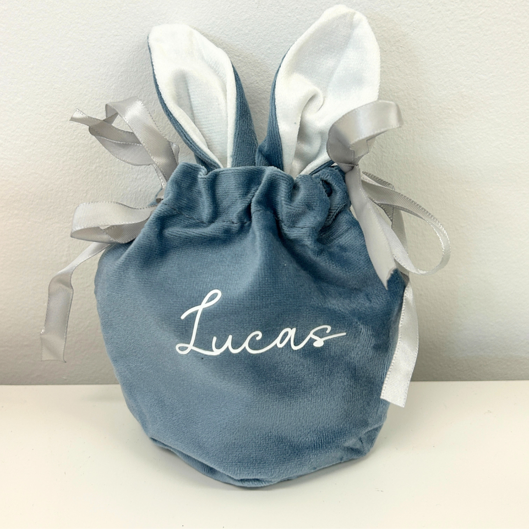 Beautiful velvet drawstring bags with bunny ears and any added personalised name