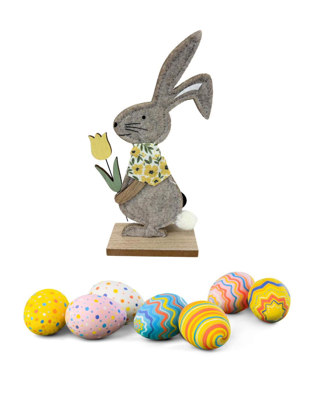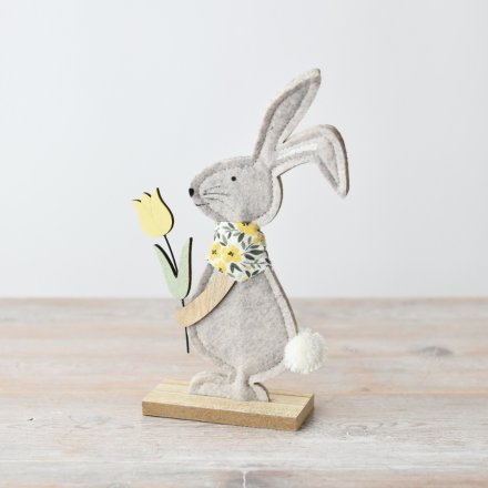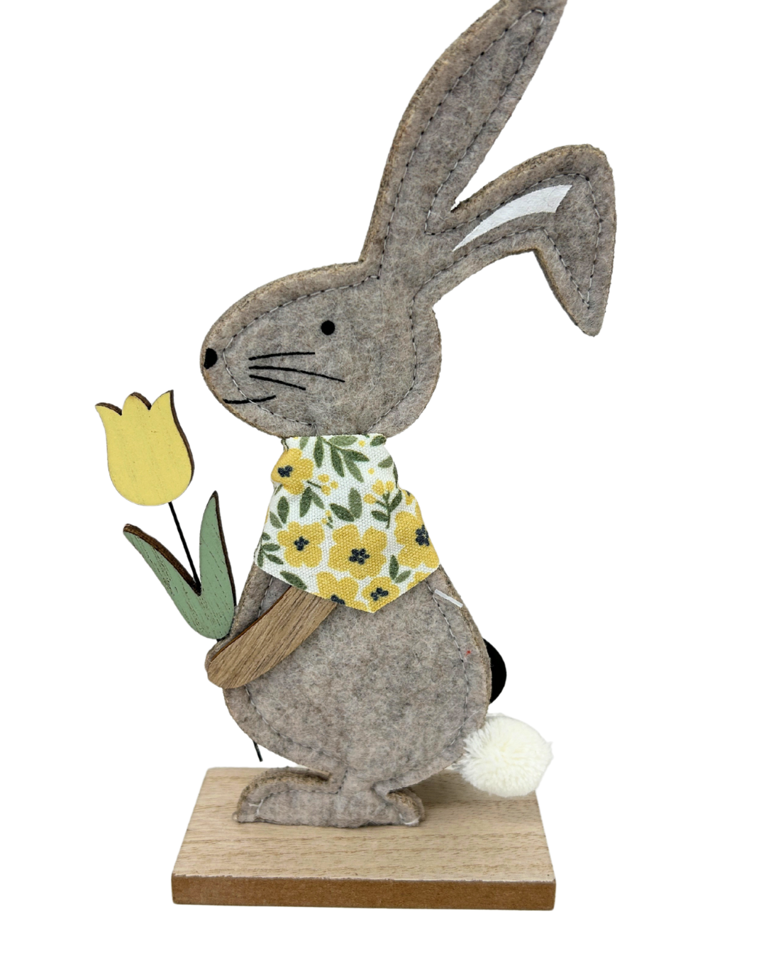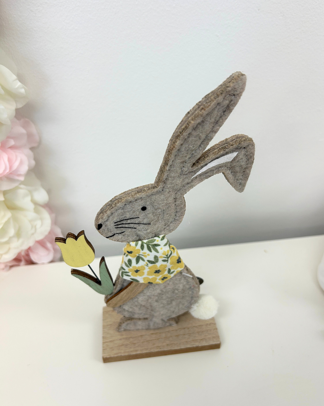 Add a touch of easter magic to your home decor with this adorable bunny featuring a soft grey fabric body, accented with a bright yellow flower and sits atop a natural wooden base.